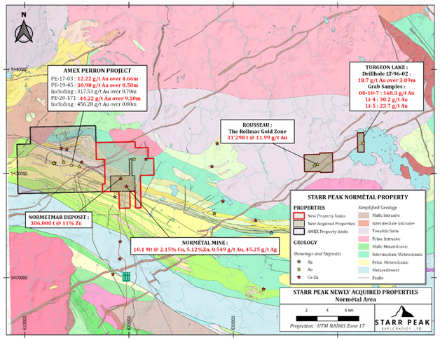 “We are thrilled to add the past producer Normetal Mine and the Normetmar showing to our Newmetal Property. We now are strategically situated on trend and on strike between (and including) a past producing gold mine and Amex Exploration’s world class discovery. Additionally, the addition of the Rousseau and Turgeon Lake Properties now defines Starr Peak as a major player in this district. The historical work is extremely impressive with very high grade gold being found and we will target these results to try to find a larger gold system. The successful techniques and new theories that have been instrumental in leading to the major discovery for our neighbor Amex Exploration will no doubt be applied to all of our properties.”
