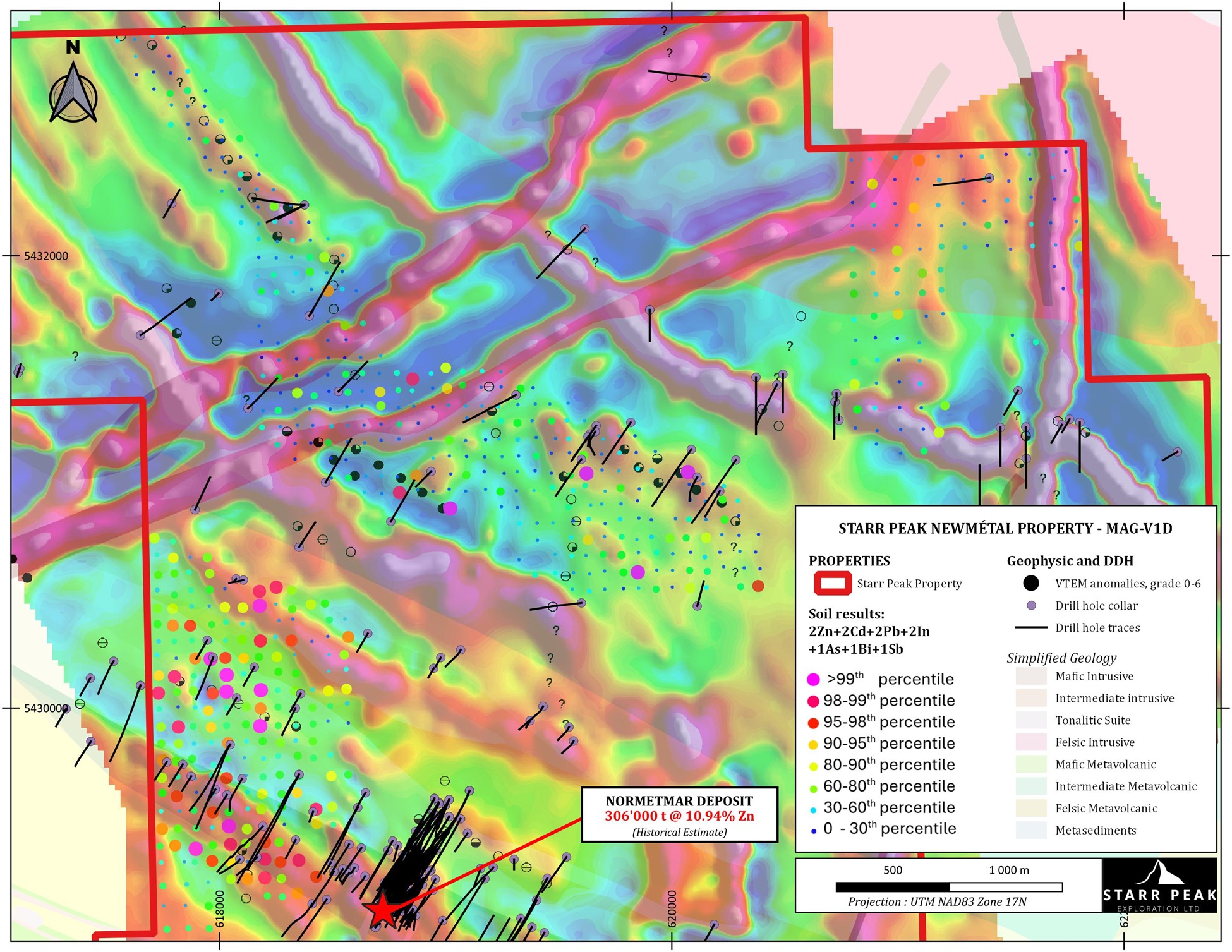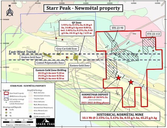 The 2022 Normetmar deep VMS discovery and the new geophysical BHEM deep plate along the long deeper hole will be a focus for next drilling phase targets. This is in accordance with a potential for continued mineralization at depth when compared to the old historical Normétal mine, which was mined down to 2,400 metres. (See press release: Starr Peak Discovers Massive New Untested Bhem Anomaly On The Normetmar Deep Zone And Reports Drill Program Update, dated October 25, 2022). The next drilling campaign will also include testing geochemically anomalous areas, some of which overlap with priority VTEM geophysical anomalies.