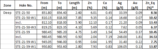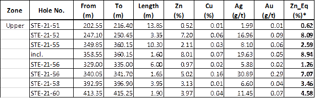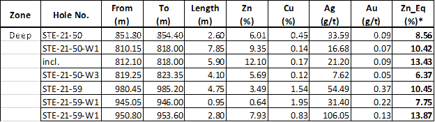 STE-21-59, the deepest 2021 drill hole to date, highlights the potential outside the geophysical plates, following the mineralized trend. Drilling will shift to testing the Deep Zone defined by the new interpreted BHEM plate. As well, systematic delineation drilling of the Upper Zone continues to expand the limits of the zone. See below Table 1, Table 2 and Figure 1 showing up to date assay results and Zinc Equivalent (Zn_Eq) calculations of drill hole mineralized intervals.