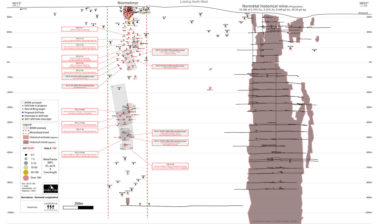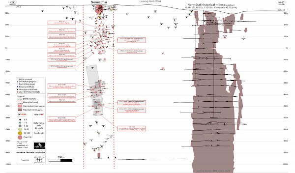 Figure 1: Longitudinal Section of the Normétal Past-Producing Mine and Normetmar Satellite Deposit. Drilling targets represented by a red star. Historical Drill Intercepts area provided in Zinc-Equivalent calculated using the formula in references. Abbreviation: Sp – Sphalerite, Cp – Chalcopyrite, Gn – Galena, MS – Massive sulfides, SMS – Semi-massive sulfides (under 75%), Tr – Traces, EOH – End of Hole.