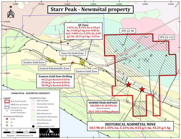 This phase of exploration will focus on the westward trend, towards Amex Exploration’s Perron Project, of gold and base metal findings from the previous Normetmar 2021 and 2022 drilling phases. The northern part of the property will also be covered in order to do a follow-up and better define 2022 drilling results (see Figure 1). See press release dated on May 18, 2022: Starr Peak Reports 5.03% Zinc-Equivalent Over 12.5 Meters, High Grade Copper Intercept, And Discovery Of New 1 KM Long VMS Horizon (https://starrpeakminingltd.com/news/starr-peak-reports-5.03-zinc-equivalent-over-12.5-meters-high-grade-copper-intercept-and-discovery-of-new-1-km-long-vms-horizon/)