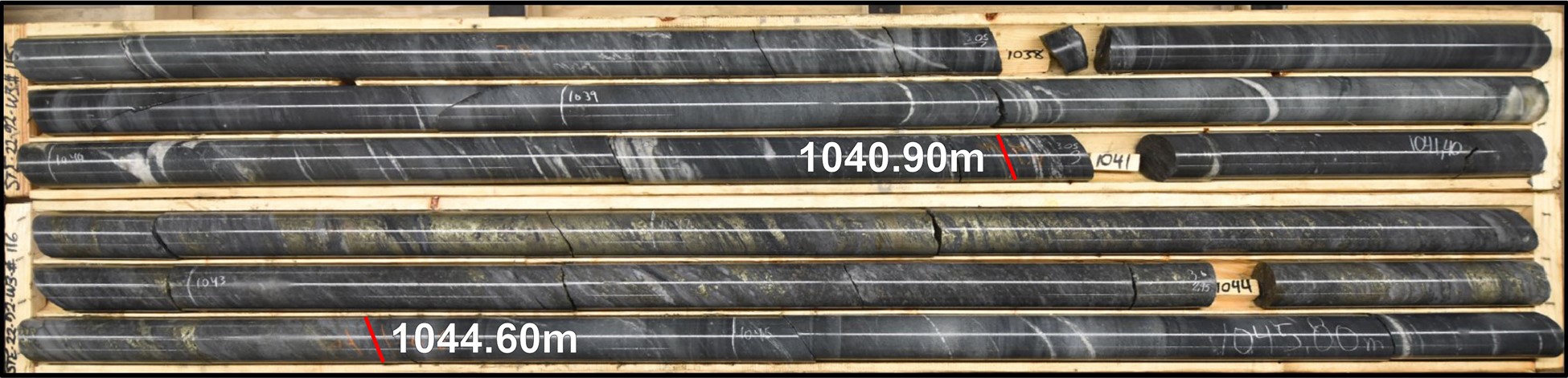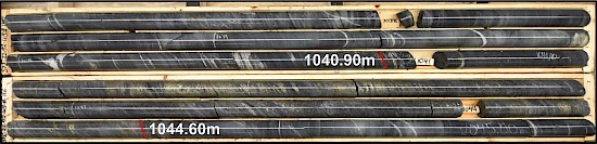 Photo 1: STE-22-92-W3; 1041.40m to 1045.80m. Stinger zone occurring from 1040.90 to 1044.60m, composed of dominantly chalcopyrite (15%) with lesser pyrrhotite (8%).