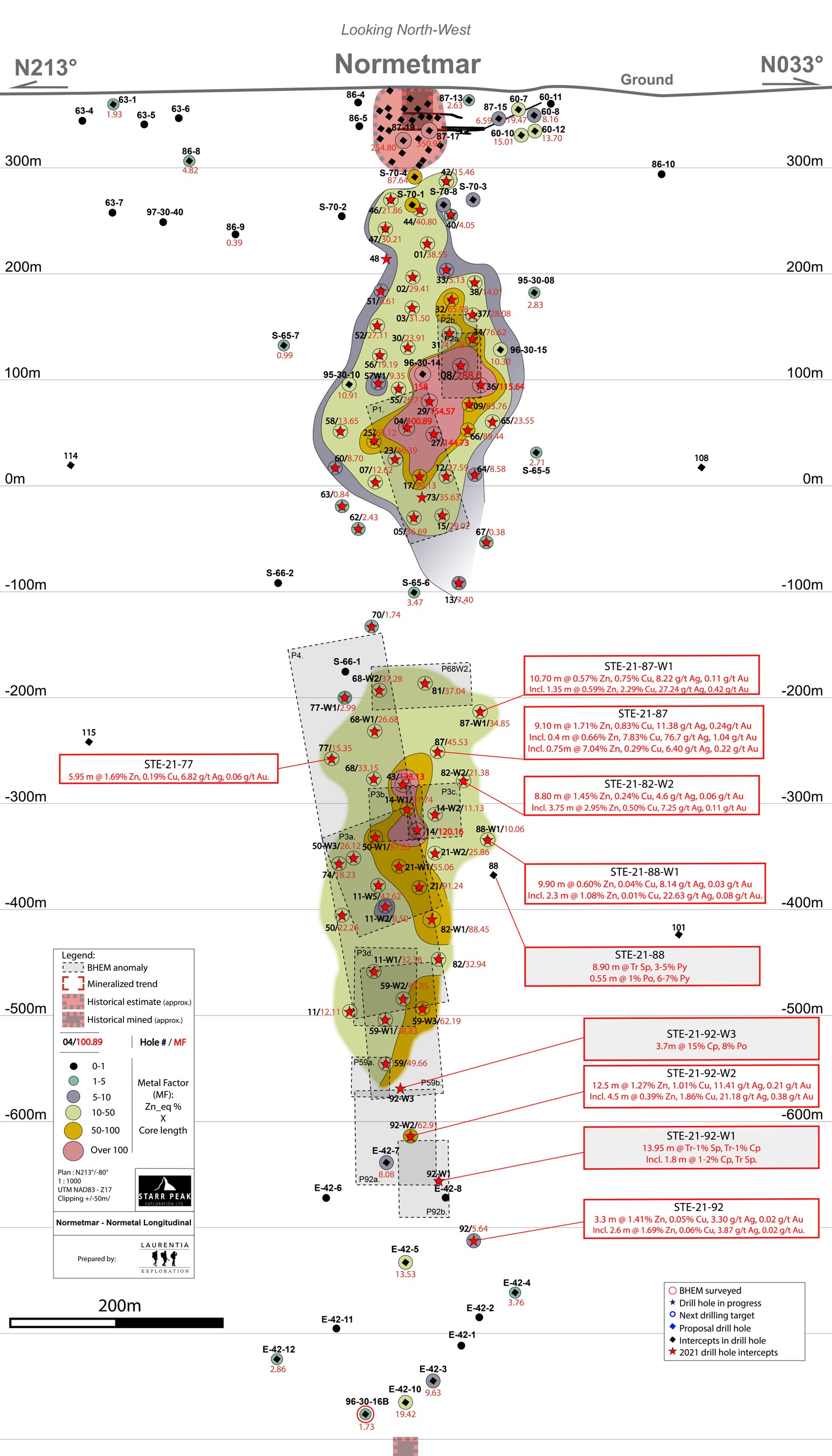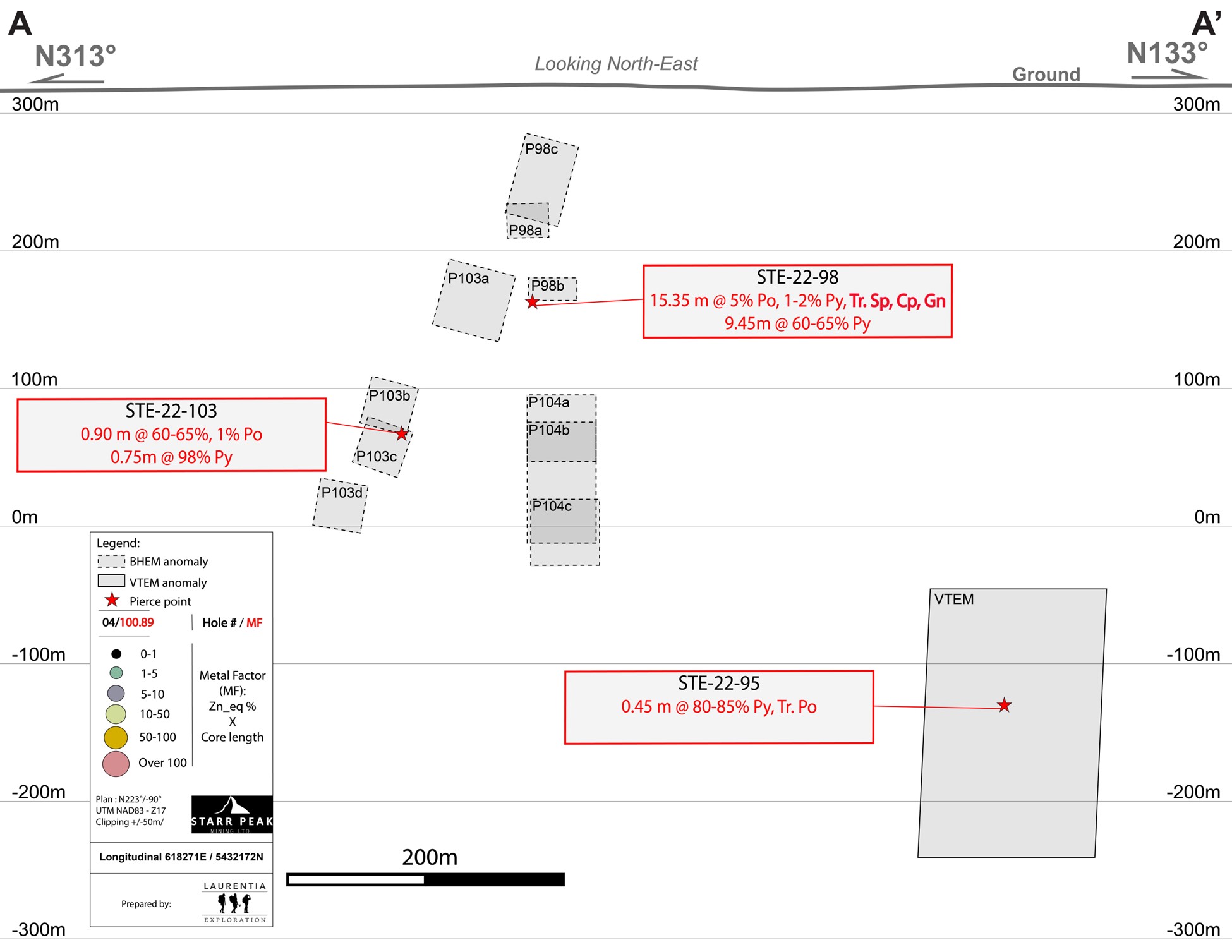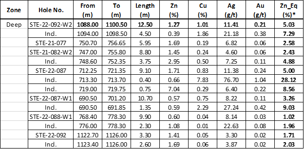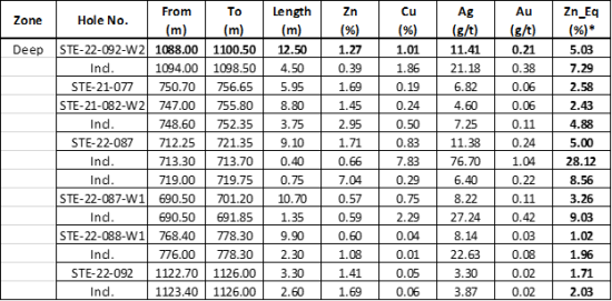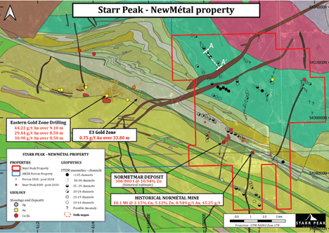 Johnathan More, Chairman and CEO of Starr Peak commented, “We are very excited by the results of our ongoing drilling campaign. Drilling of the Deep zone continues to return economic intervals, including 5.03% Zn_Eq over 12.5 m in hole STE-22-092-W2. The wedge hole above this one has intersected a copper-rich interval of 3.7 m carrying over 15% chalcopyrite for which assays are pending. In the Northern part of the NewMetal property, a newly discovered volcanogenic massive sulphide (“VMS”) horizon highlights the potential of Starr Peak’s ground for new discoveries and project value creation/enhancements. The discovery also reinforces the exploration strategy our technical team is following.”