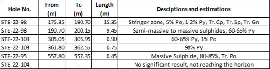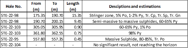 A new volcanogenic massive sulphide horizon has been discovered 3 km North of the Normetmar historical deposit. The horizon is hosted in intermediate volcanics from the lower member of the Normetal volcanic complex (Table 2, Figure 2 and Figure 3). Three holes have intersected the horizon, with hole STE-22-98 intersecting 15.35 m of sulphide mineralization, including 9.45 m of semi-massive to massive sulphides. Trace amounts of chalcopyrite, sphalerite and galena were observed along with a chert rich interval in the core, which may suggest a fertile VMS horizon is in place. The holes that intersected sulphide intervals are described as follows: