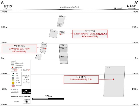Borehole electromagnetic surveys (BHEM) were completed in holes STE-22-98, STE-22-103 and STE-22-104 to date. Results are showing multiple disconnected zones and a main anomaly (P104b) of high conductance close to hole STE-22-104, which did not crosscut the horizon but followed it (Figure 3). Anomalies defined by hole STE-22-98 and STE-22-104 suggest a vertical plunge of the main mineralized zone intersected by hole STE-22-98, similar to Normetal and Normetmar historical mineralization plunge. The area initially covered by 2021 VTEM survey is open in every direction without historical drilling and VTEM anomalies are visible over 1 km long.