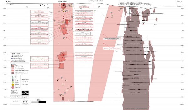 Figure 1: Longitudinal Section of the Normétal Past-Producing Mine and Normetmar Satellite Deposit. Drilling targets represented by a red star. Historical Drill Intercepts area provided in Zinc-Equivalent calculated using the formula in references. Abbreviation: Sp – Sphalerite, Cp – Chalcopyrite, Gn – Galena, MS – Massive sulfides, SMS – Semi-massive sulfides (under 75%), Tr – Traces, EOH – End of Hole.