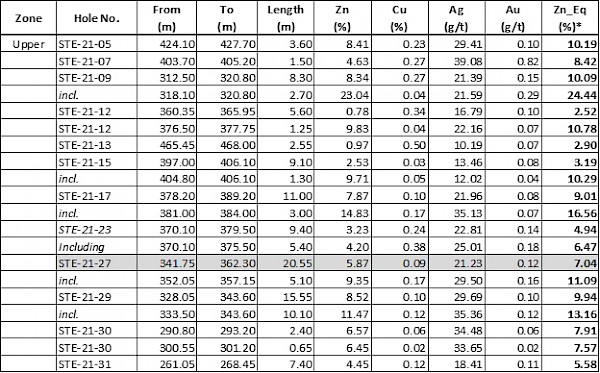 In addition to the Deep zone drilling, multiple drill holes targeting the Normetmar Upper zone (above 400m vertical depth) intersected wide mineralized intervals up to 20.55 metres indicating the presence of a significant VMS zone (STE-21-27). Systematic drilling of this zone is in progress to better define and understand mineralization distribution. See below Table 2 and Figure 1 showing the most recent assay results to date.