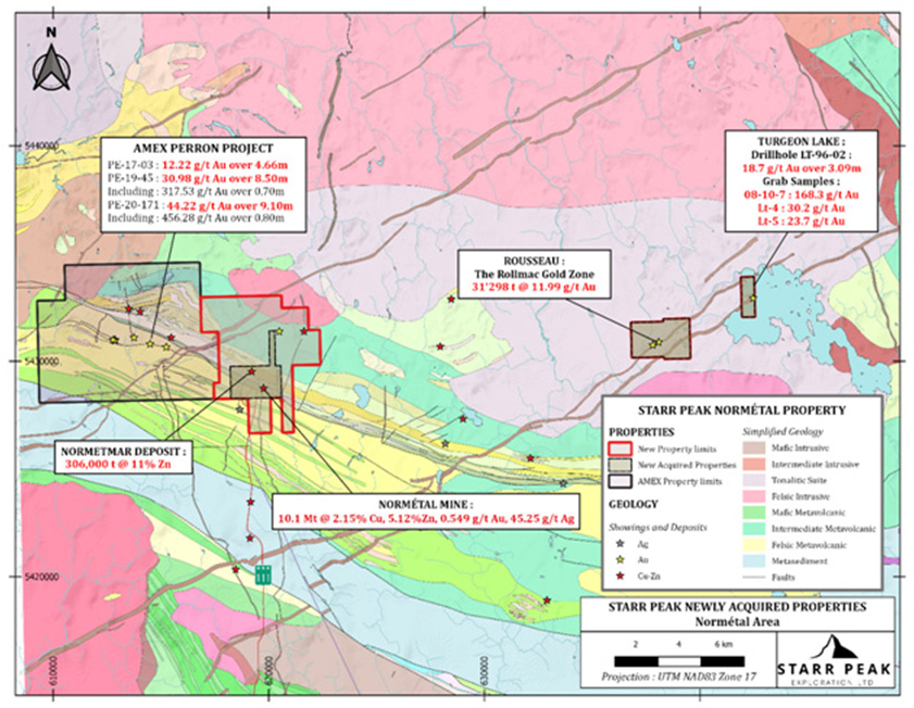 On August 10, 2020, Starr Peak Mining expanded its NewMétal property by acquiring 100% interest into Globex Mining Enterprises projects known as the Normetal/Normetmar gold, copper, zinc and silver property, the Rousseau gold property and the Turgeon Lake gold property.