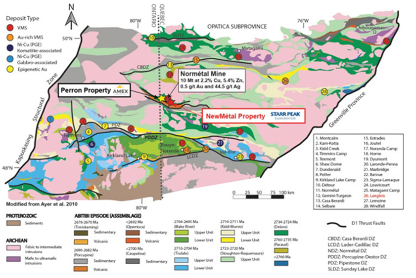 Figure 2: Regional Geology of the Abitibi Greenstone Belt and localisation of Starr Peak's NewMétal Property.